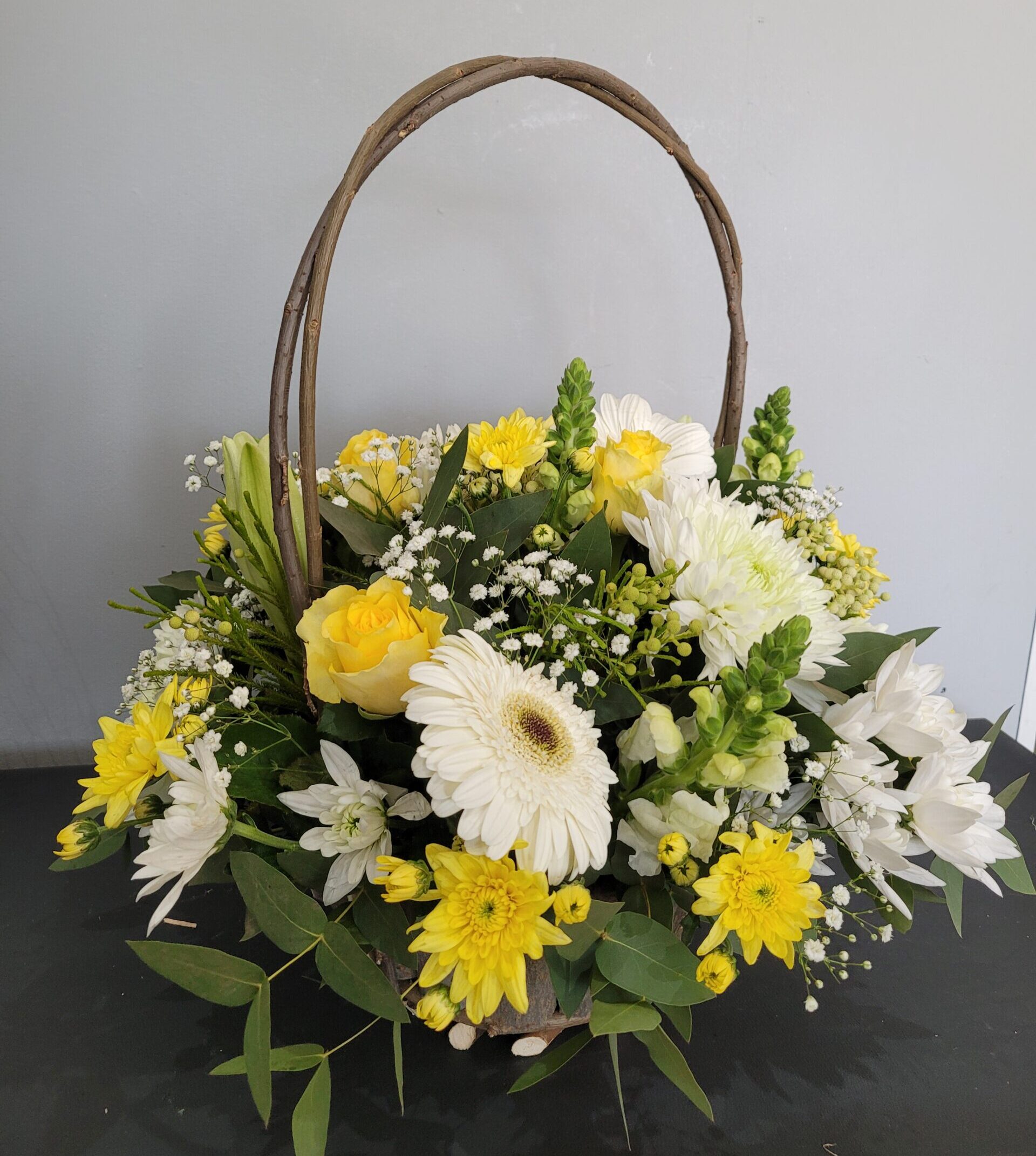 The refreshingly appealing white and yellow combination of lilies, roses, gerberas, sprays & stems in this adorable basket, will bring an affectionate hug to a home.