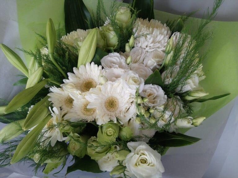 A tranquil hand tied bunch consisting of a placid combination of seasonal white and green flowers.