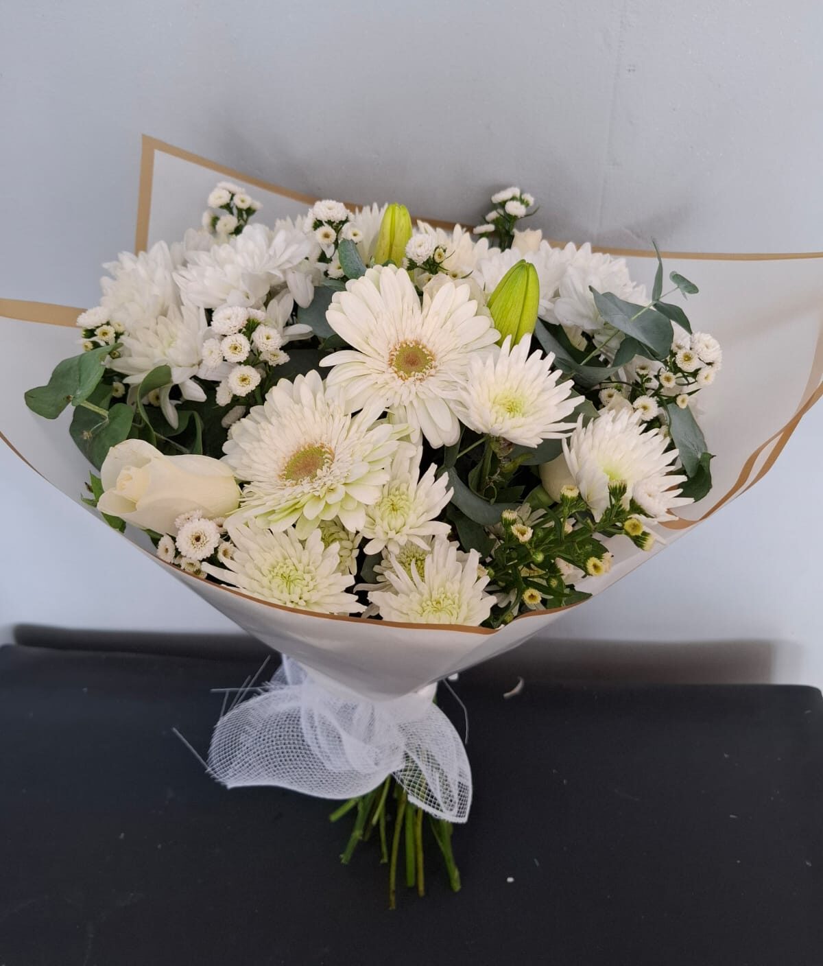 Tranquil combination of seasonal Lilies, gerberas, roses, lisinathus and white stems