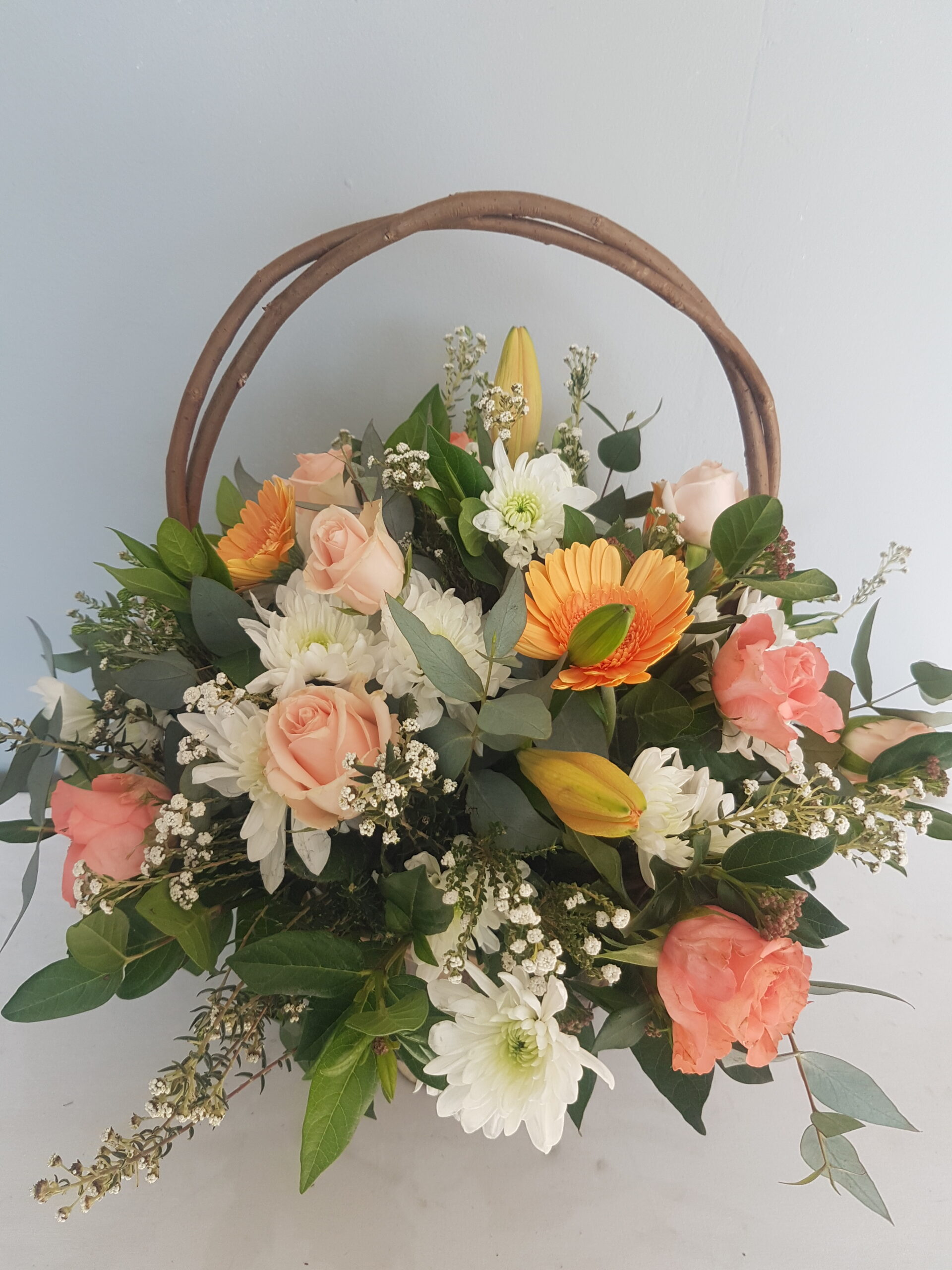 This Charming basket in peach/pink and white- with roses, lilies and chrysanthemums will bring friends our Heartfelt love