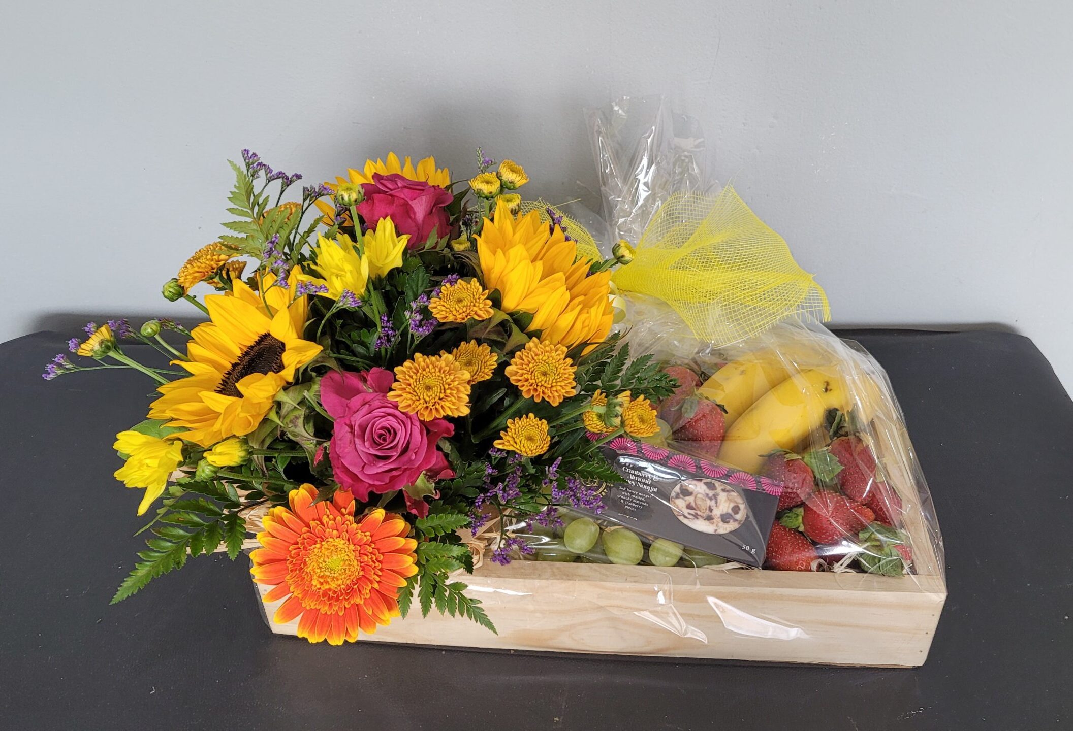 Pleasures of flowers & snacks in one basket.
