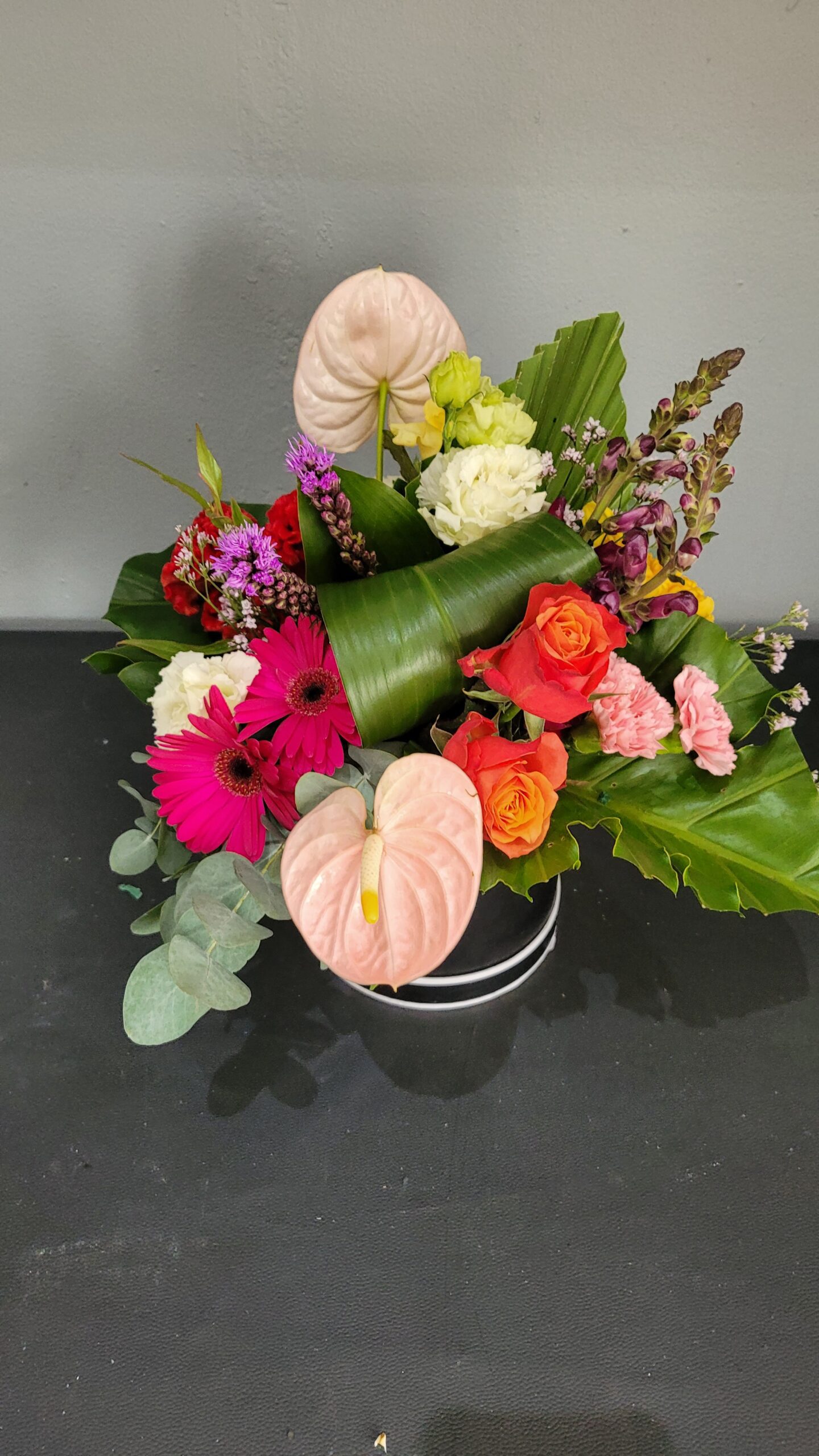 Honour your loved one with a modern, bright, colourful hat box, with an array of seasonal flowers.