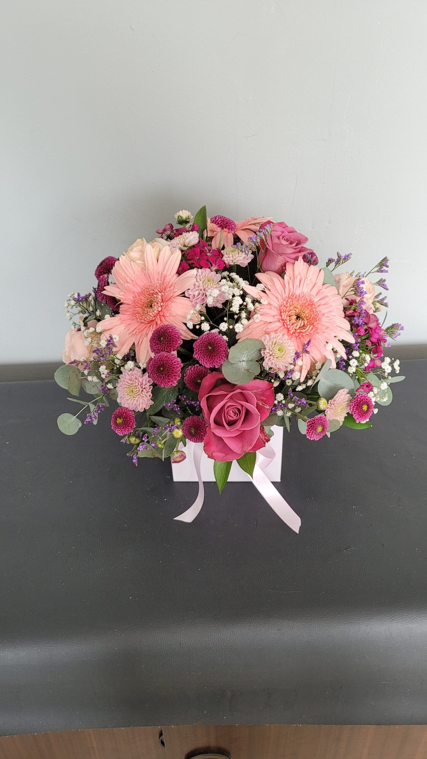 Beautiful seasonal pink and lilac flowers in a hat box. Perfect for special occasions, especially to make someone feel extra special.